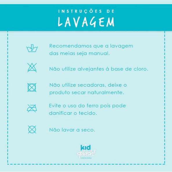 LAVAGEM: Recomendamos que a lavagem das meias seja manual. Não utilize secadoras nem alvejantes à base de cloro. Evite o uso do ferro pois pode danificar o tecido; Não lavar a seco.