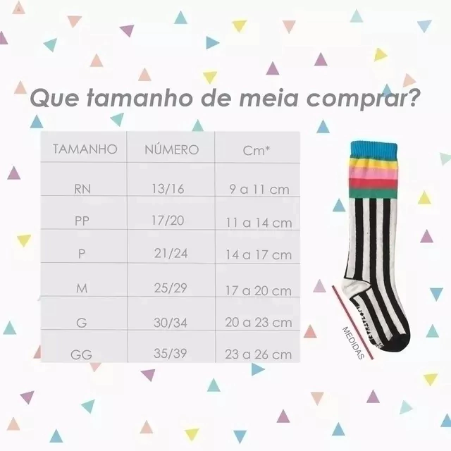 Ahhhhhh, nossas meias são super coloridas com muitas formas, desenhos, figuras e isso pode apresentar pequenas variações de entre um modelo e outro no tamanho aparente, todas as meias são produzidas para VESTIREM o pezinho, ou seja, quero dizer que se você escolheu com as dicas acima, não se preocupe! Vai ficar PERFEITA!