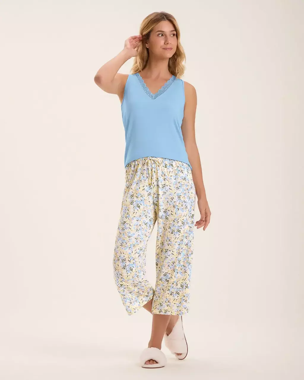 A regata azul clara possui decote em V com acabamento em renda na mesma cor, trazendo feminilidade, charme e suavidade ao visual. Já a calça pantacourt apresenta estampa rotativa floral em tons suaves, criando uma composição leve, romântica e harmoniosa.
