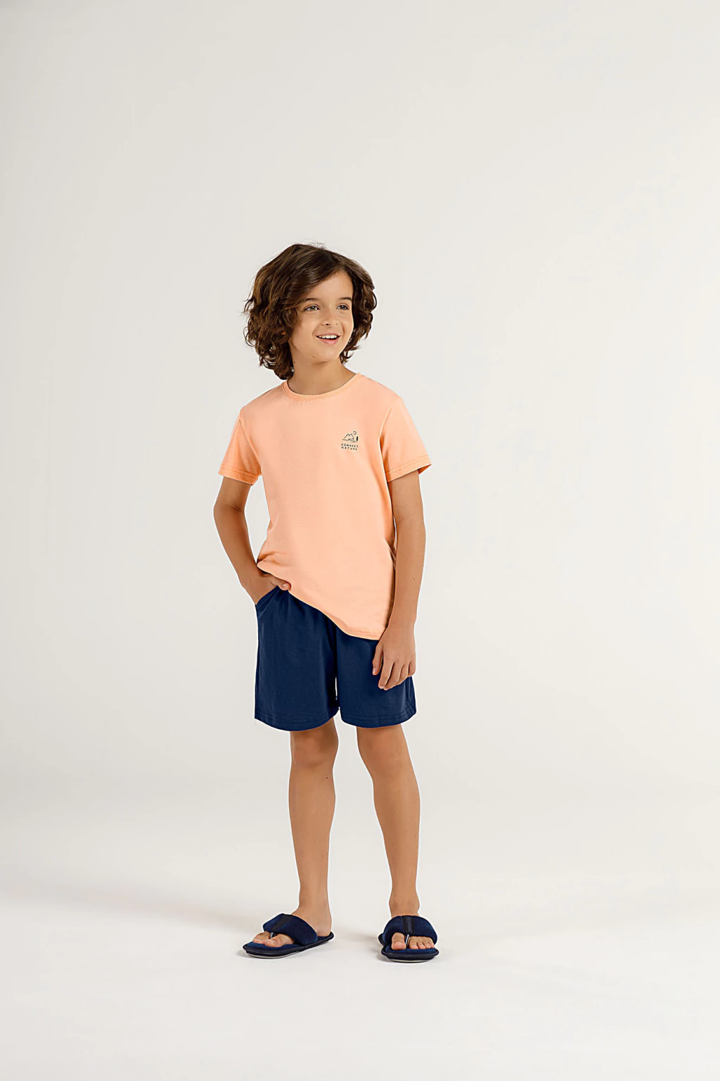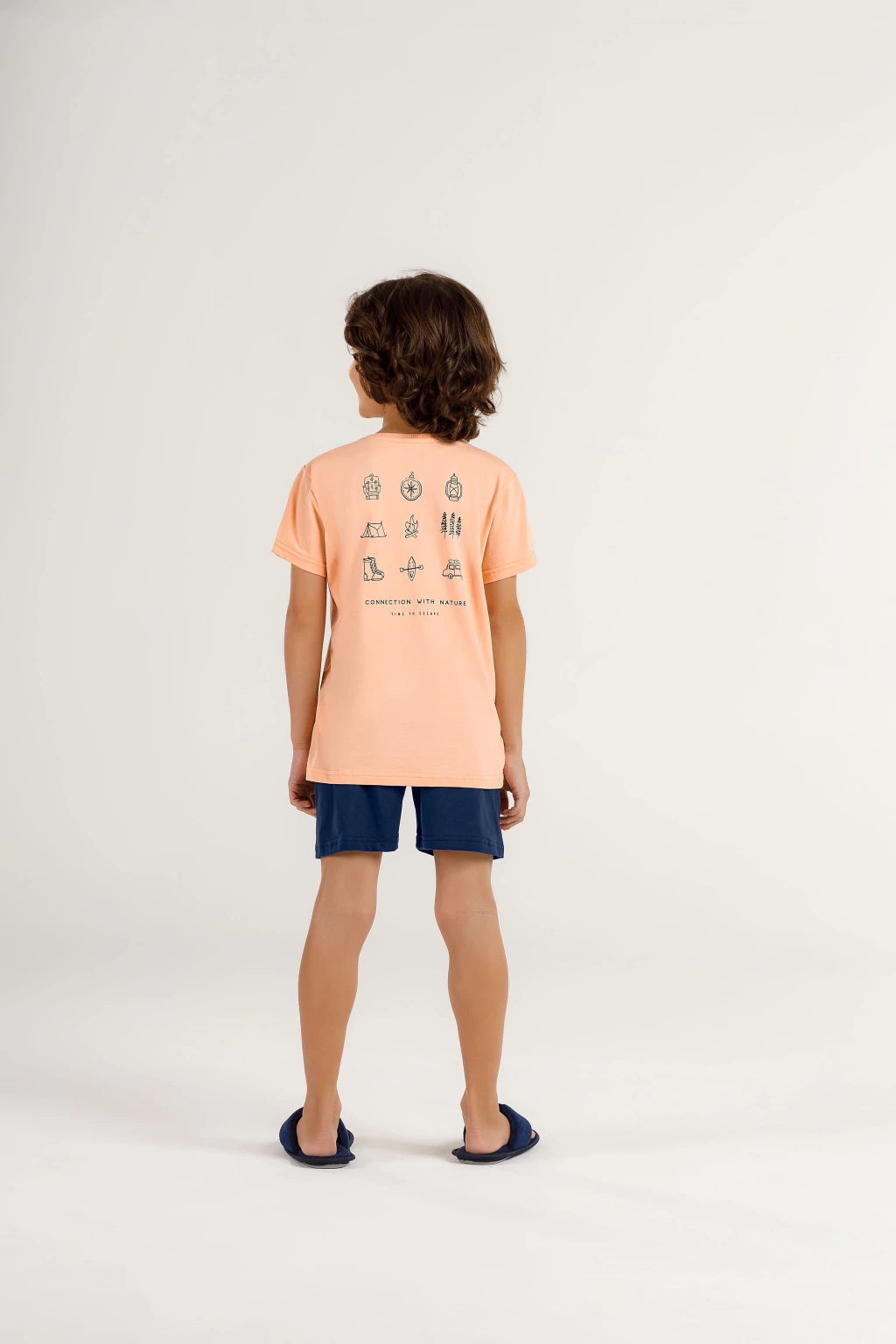 Pijama Masculino infantil manga curta com bermuda., blusa laranja com estampa frente e costas, trazendo os inspiradores dizeres "Connect Nature" (Conecte com a Natureza) na frente e "Connection with Nature - Time to escape" (Conexão com a natureza - Tempo de Escapar) nas costas; combinada com uma bermuda em marinho com cadarço funcional em marinho e detalhes em laranja, forma um conjunto que convida a uma conexão mais profunda com a natureza. Disponível na versão pai e filho, este pijama garante conforto e maciez para uma noite de sono tranquila e aconchegante.