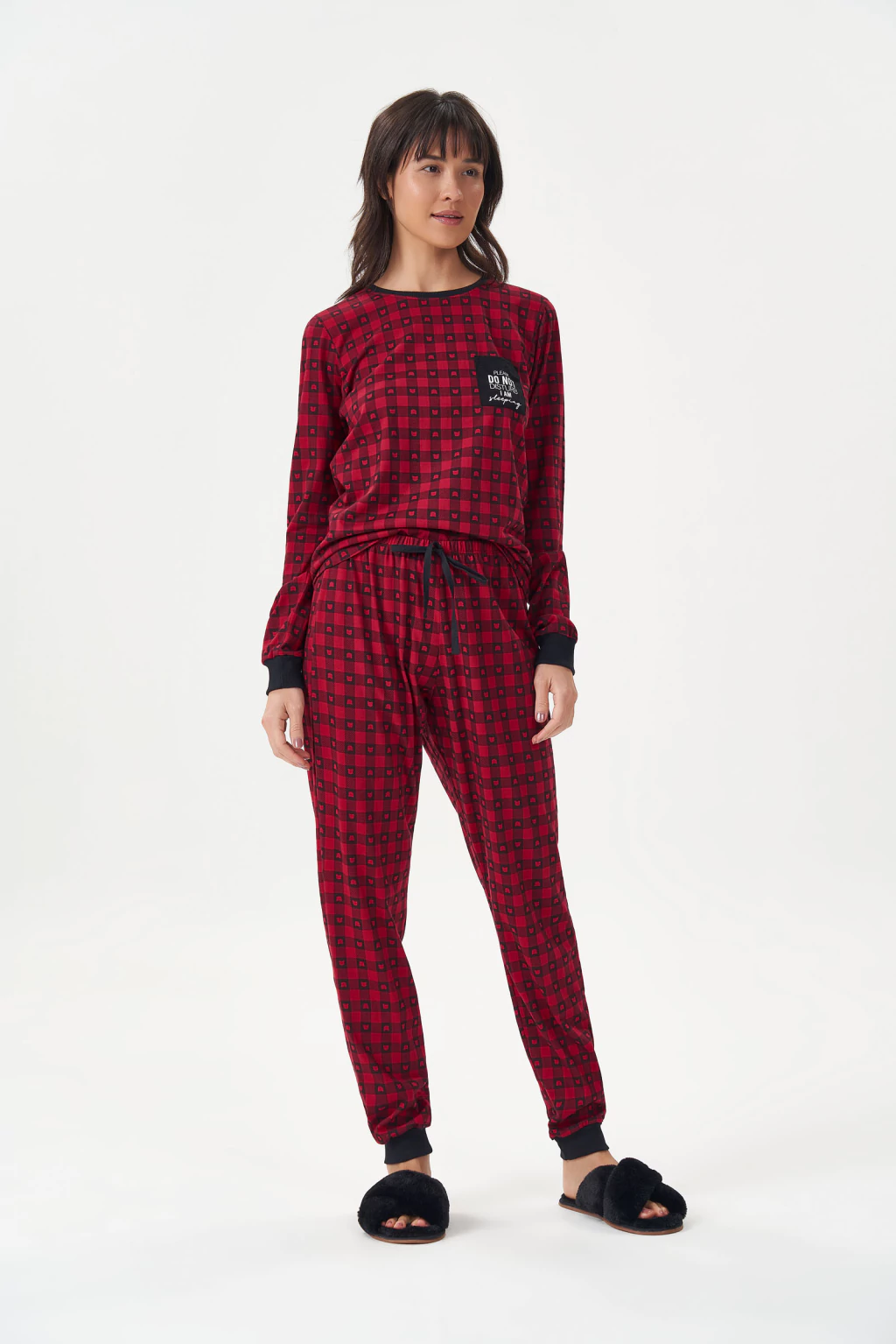 Pijama manga longa em malha comfort 100% algodão! Estampa roativa de xadrez com uma brincadeira de carinha de ursinho, uma opção super fofa. Decote redondo em ribana canelada contrastante. Bolso localizado contrastante com estampa. Mangas com acabamento de punho em ribana canelada contrastante. Calça com cintura de elástico 2cm e falso amarrador em cadarço de algodão contrastante. Modelagem jogger com acabamento em punho de ribana canelada contrastante. Uma ótima opção de coordenado para toda família.