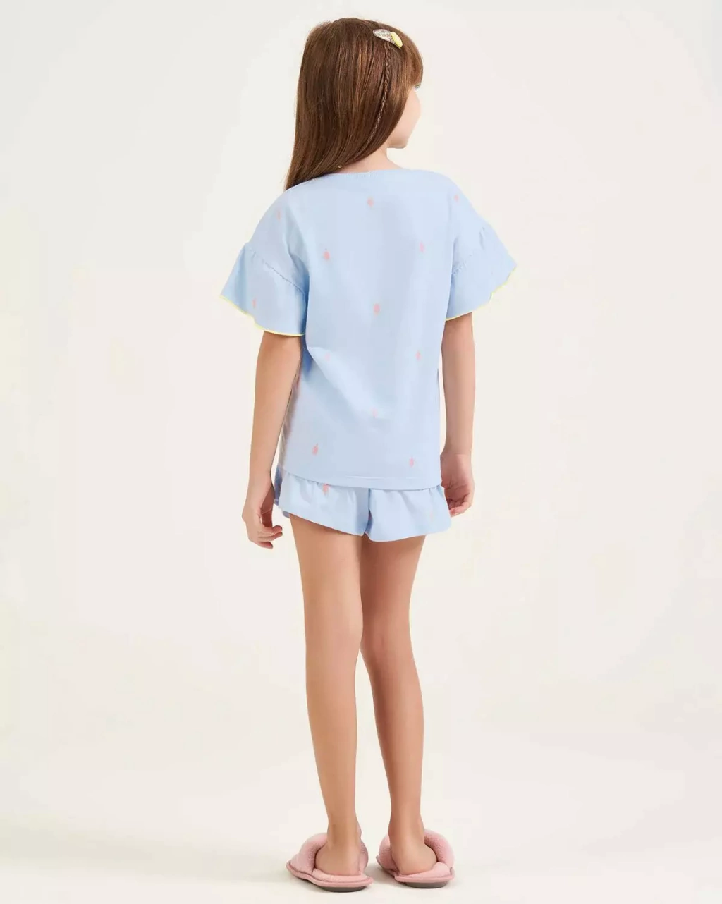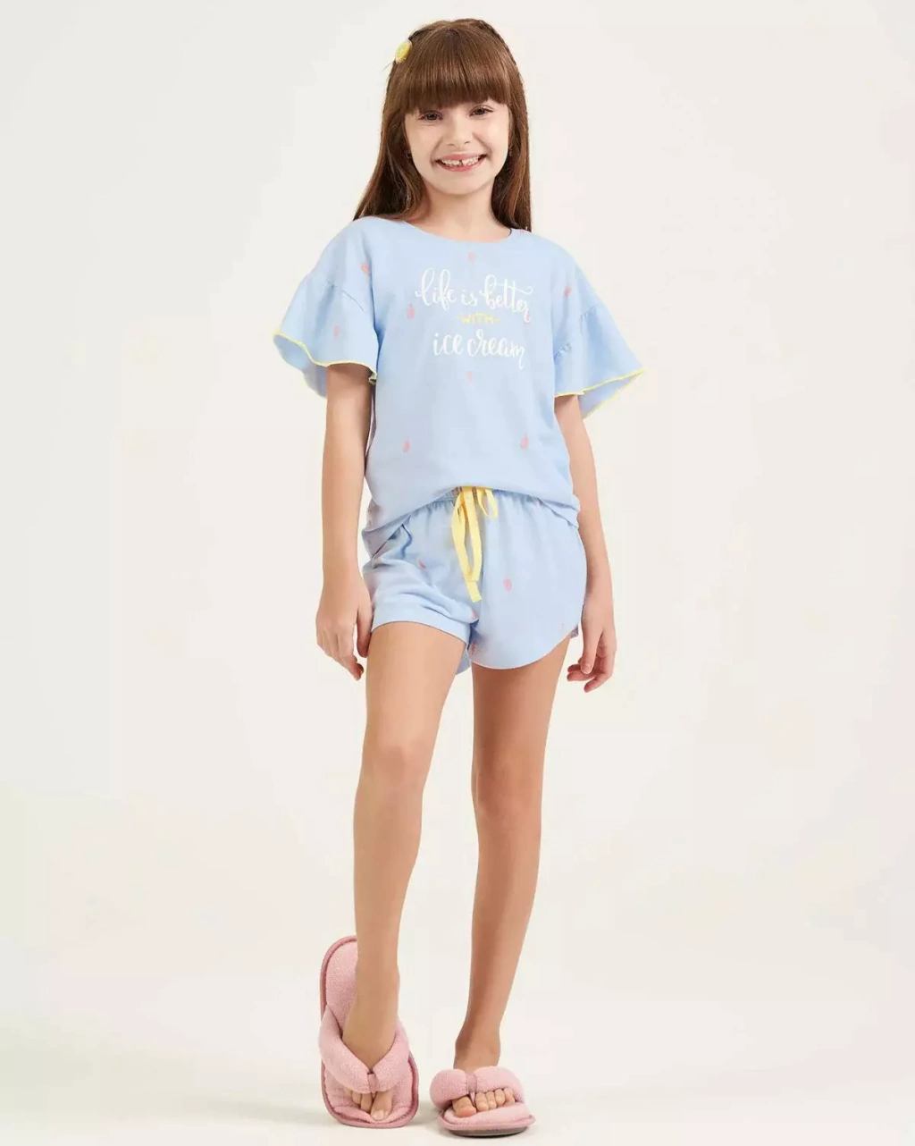 Short doll manga curta em malha comfort 100% algodão, com estampa rotativa de picolés formando gravataria. Blusa com modelagem mais solta com cava deslocada e babado formando mangas com acabamento contrastante. Short com fit mais tradicional e detalhe de falso amarrador contrastante. Um conjuto divertido e confortável que transmite toda a positividade do verão, e pra ficar ainda melhor tem pijama adultol igual para usar combinando!