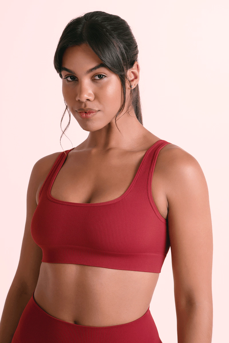 Top sem costura com estrutura canelada. Possui decote quadrado na frente e levemente mais aprofundado nas costas. Sua alça larga traz uma vestidade mais segura e confortável. Possui leve suporte, sendo ideal para práticas de atividades físicas ou até para uso casual e urbano.